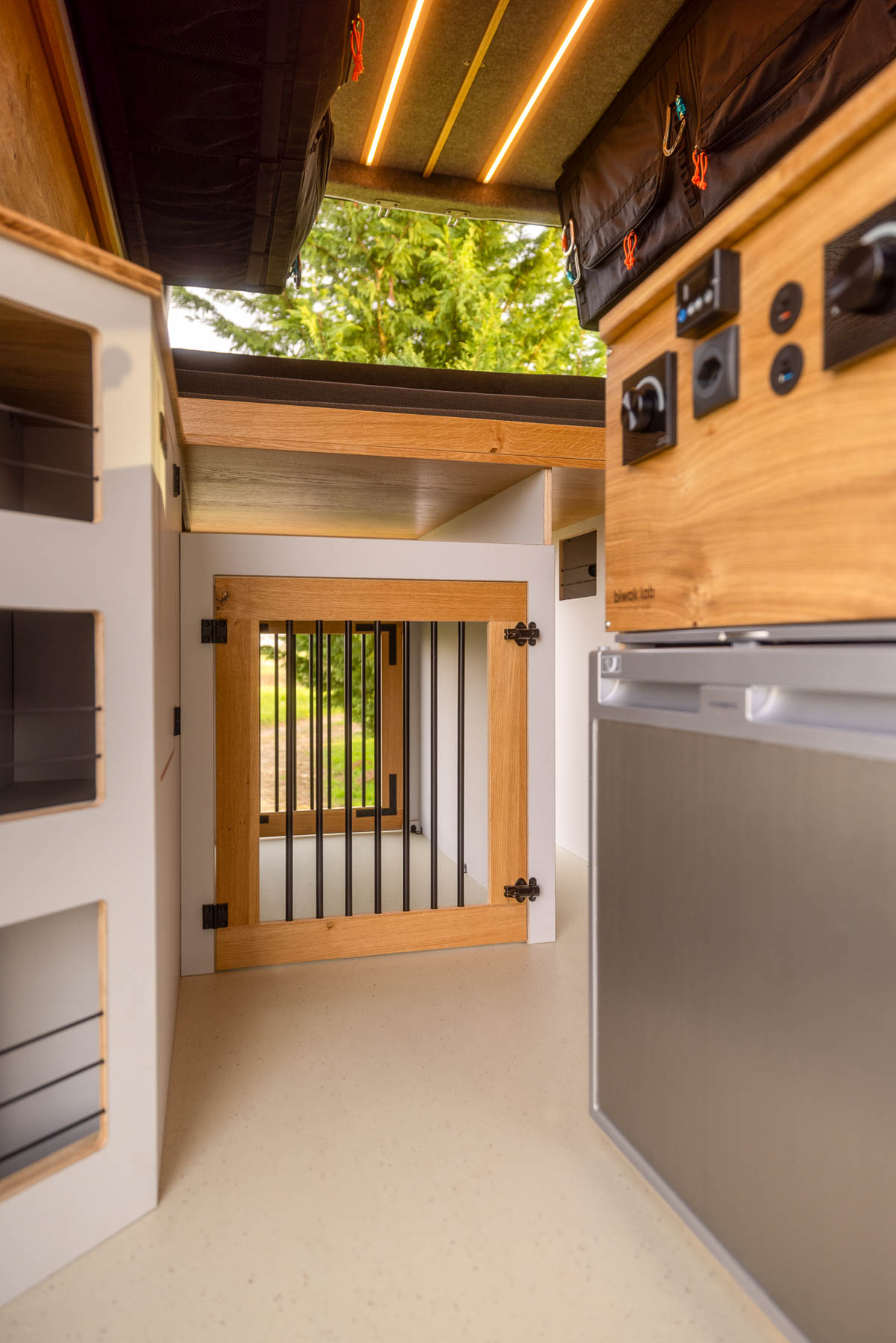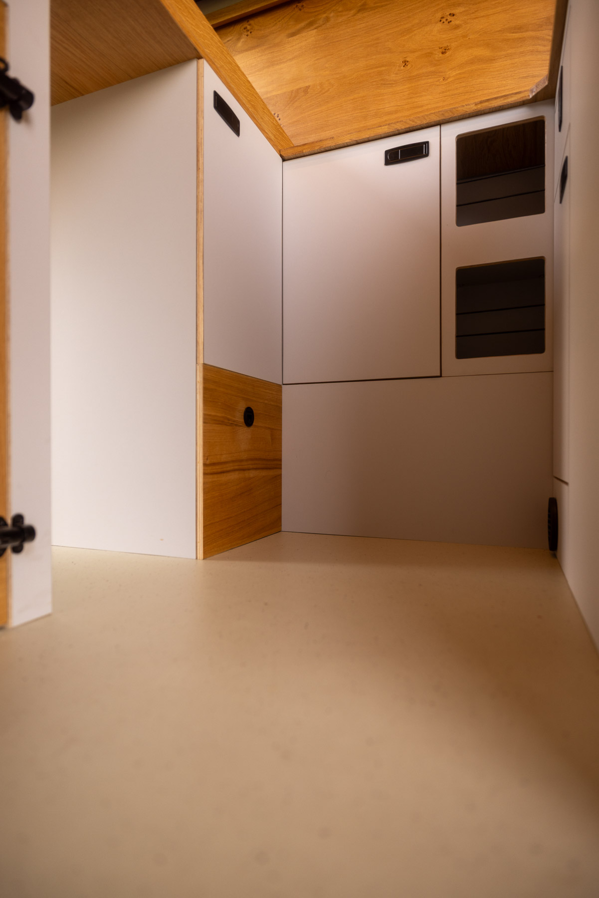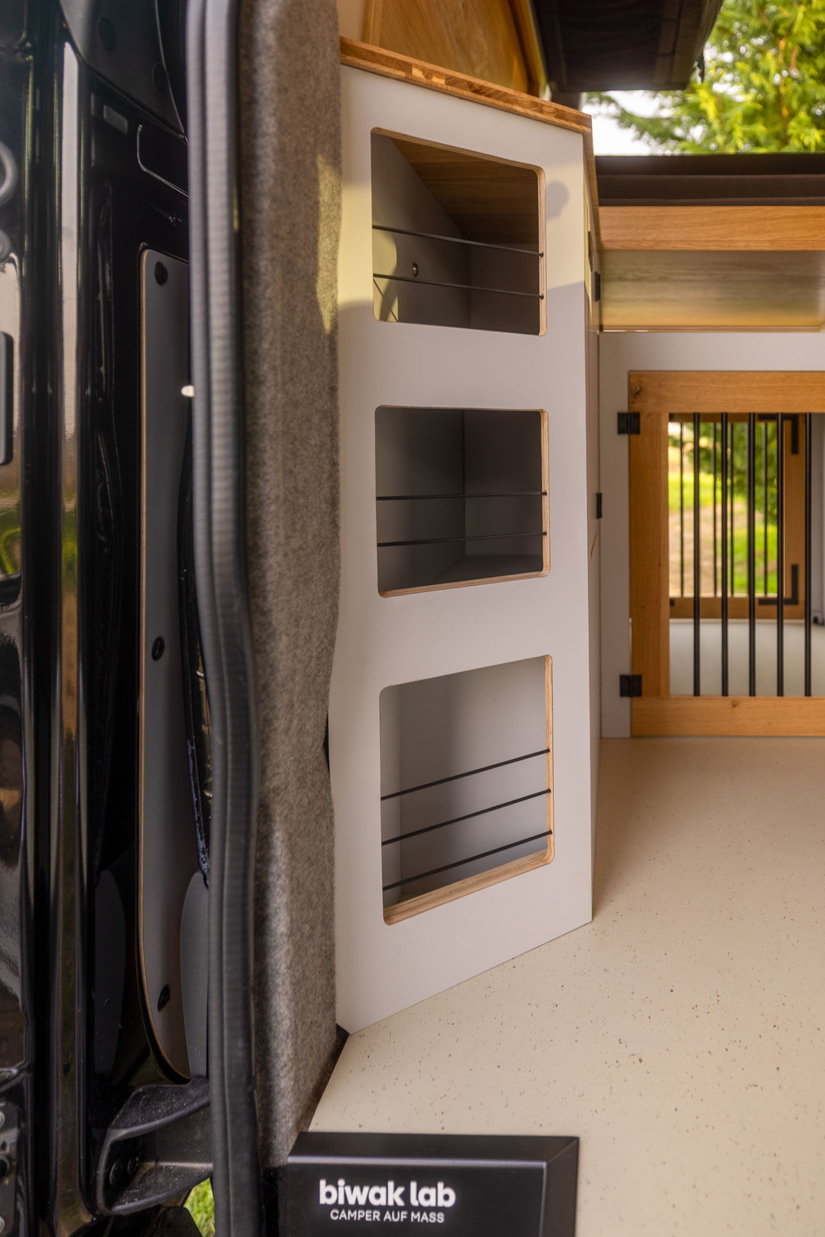 Beim Innenausbau setzt BiwakLab auf hochwertige Materialien und zeitloses Design. Charakterstarke Asteiche trifft auf modernes Perlgrau und schafft eine warme, reduzierte Atmosphäre. Schwarze Verschlussgriffe von Adam Hall sorgen für präzise Akzente und unterstreichen den hochwertigen Anspruch des gesamten Camper Ausbaus.