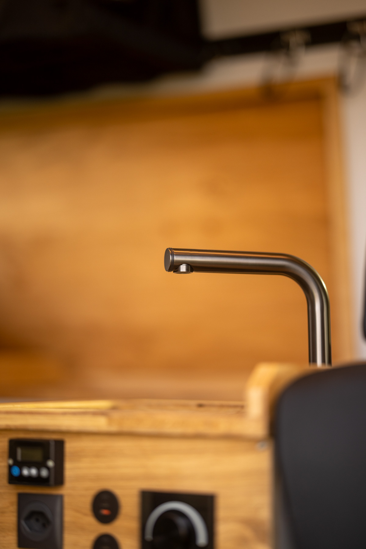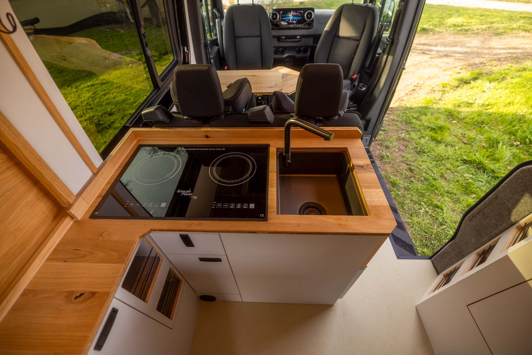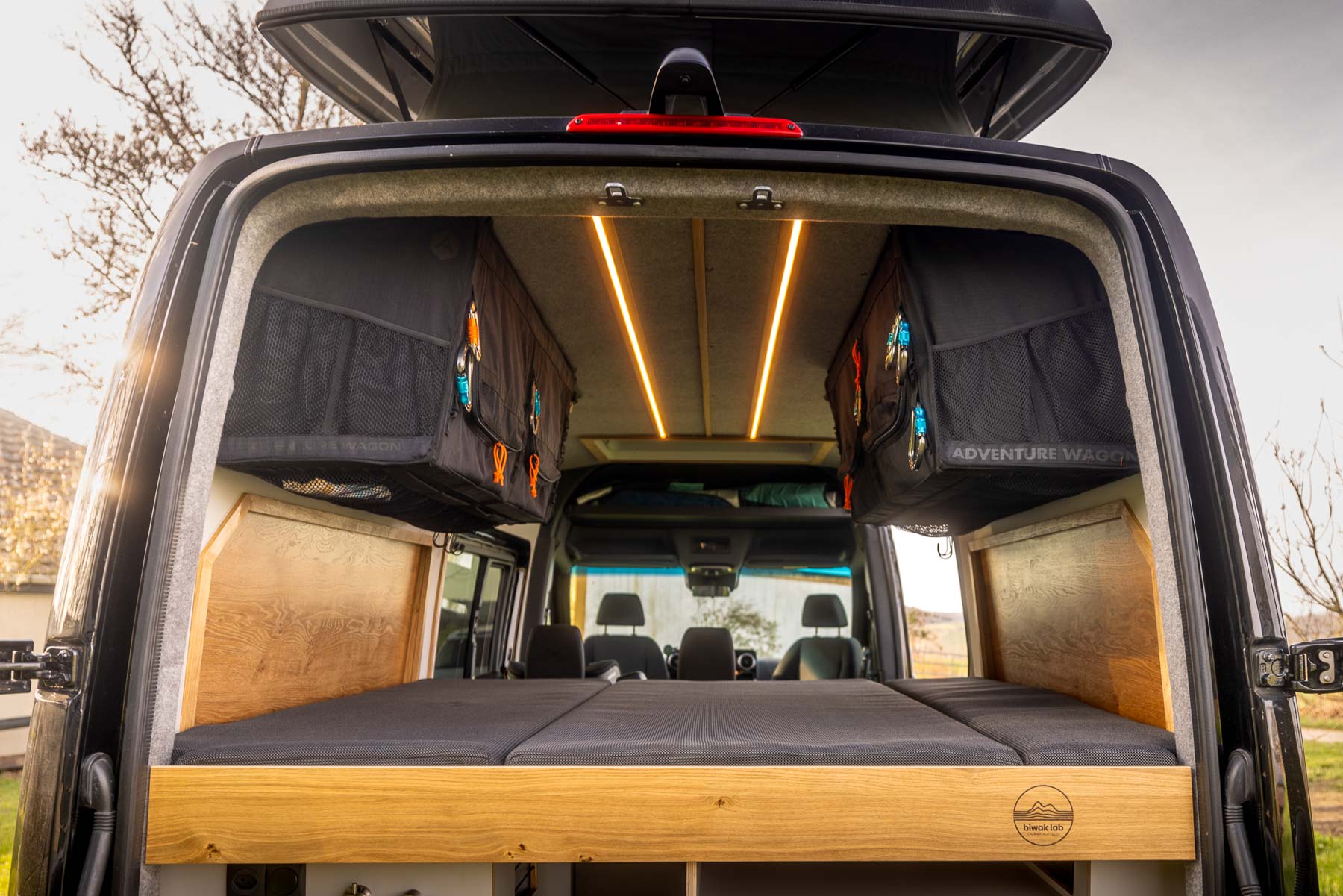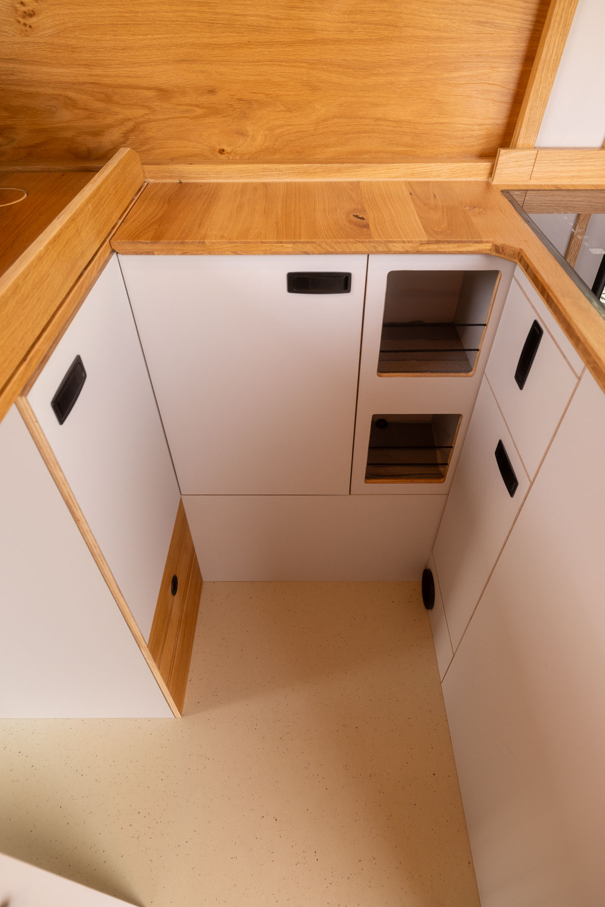 Beim Innenausbau setzt BiwakLab auf hochwertige Materialien und zeitloses Design. Charakterstarke Asteiche trifft auf modernes Perlgrau und schafft eine warme, reduzierte Atmosphäre. Schwarze Verschlussgriffe von Adam Hall sorgen für präzise Akzente und unterstreichen den hochwertigen Anspruch des gesamten Camper Ausbaus.